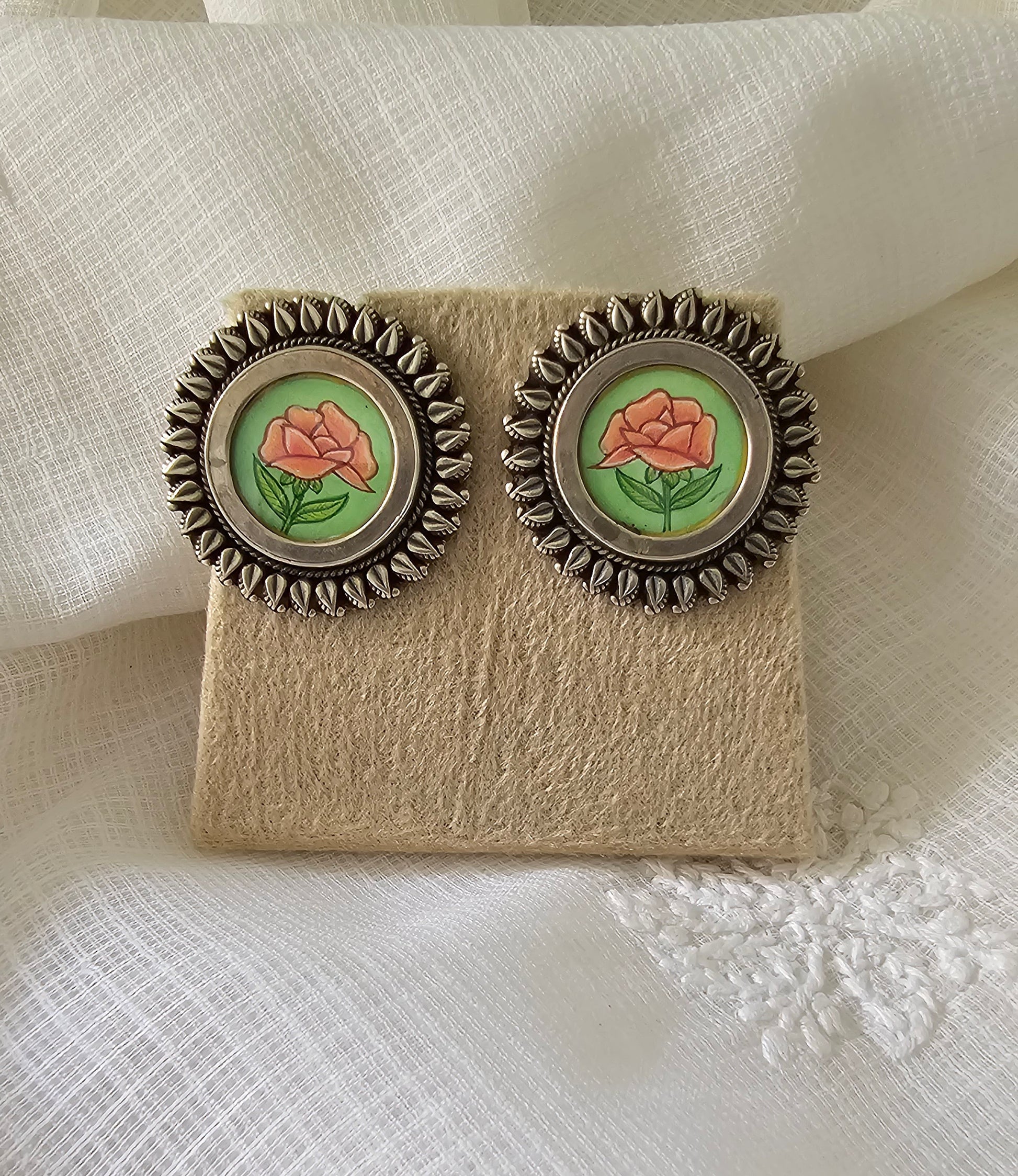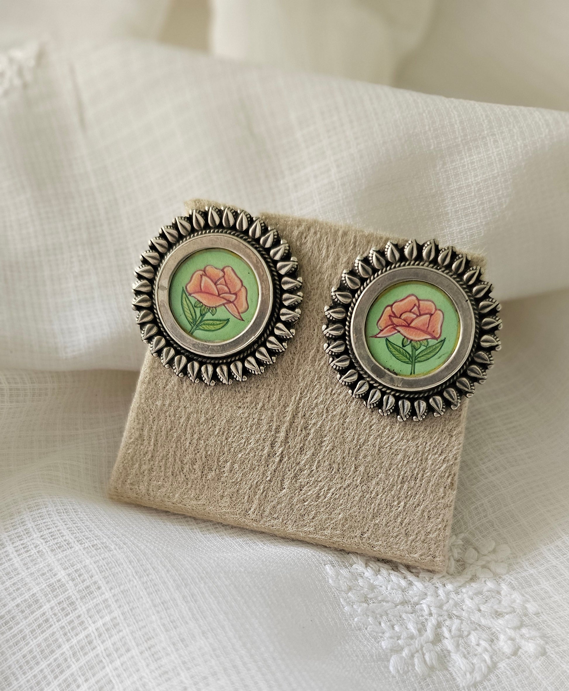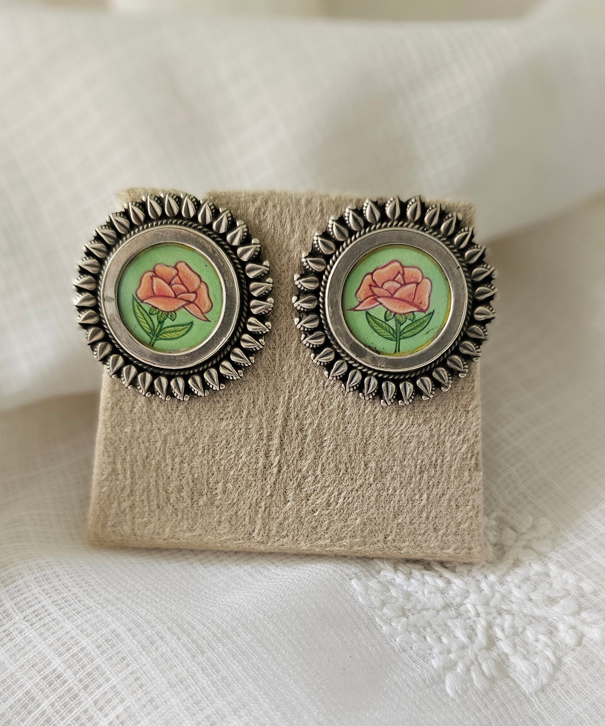 92.5 silver studs in round shape hand painted rose flower in pastel shades ..