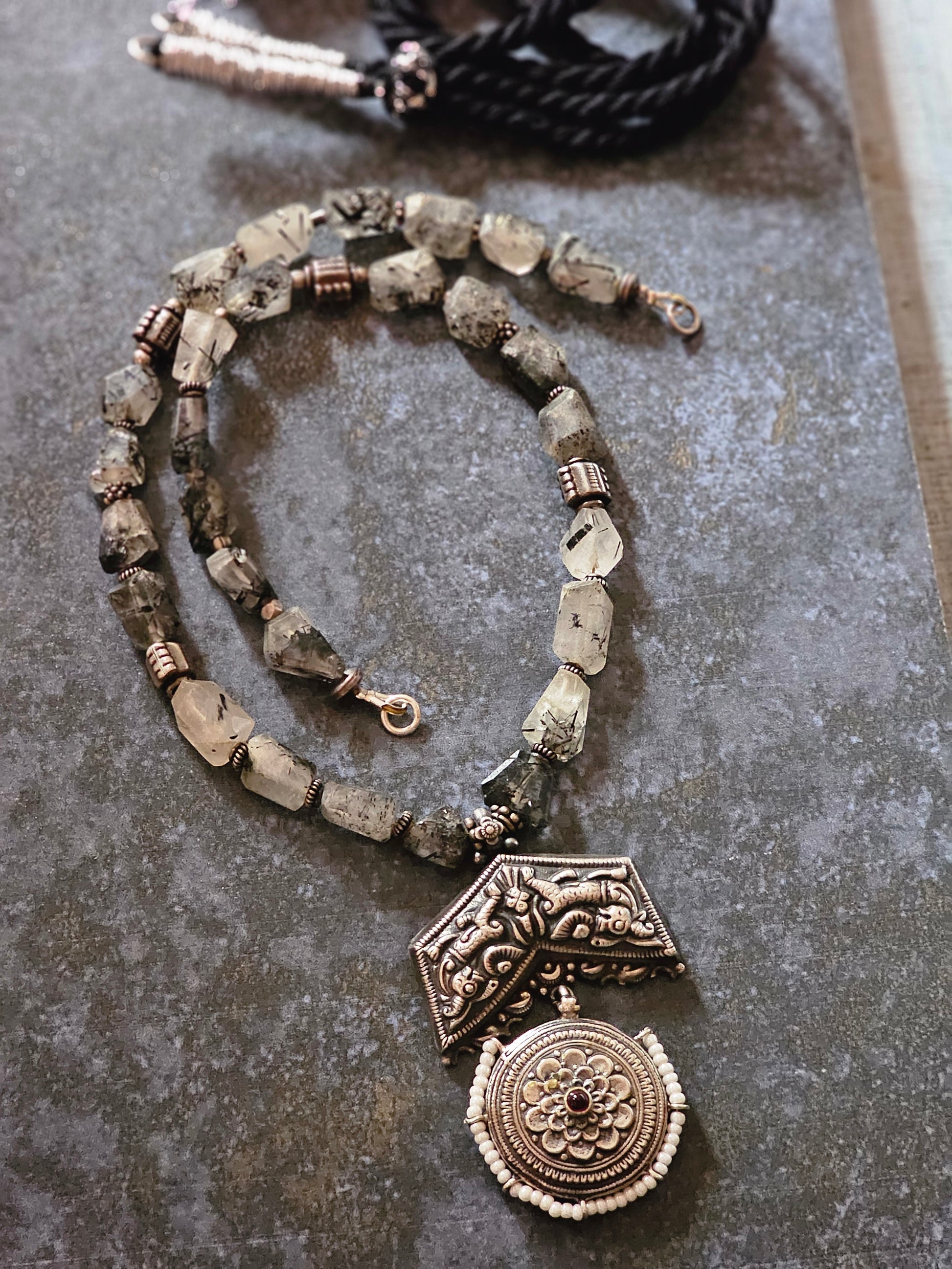 And this black rutilated quartz necklace is just perfect for any occasion. It comes with an adjustable tassel behind. The pendant is fusion between nakash and Kolhapuri rakodi design.