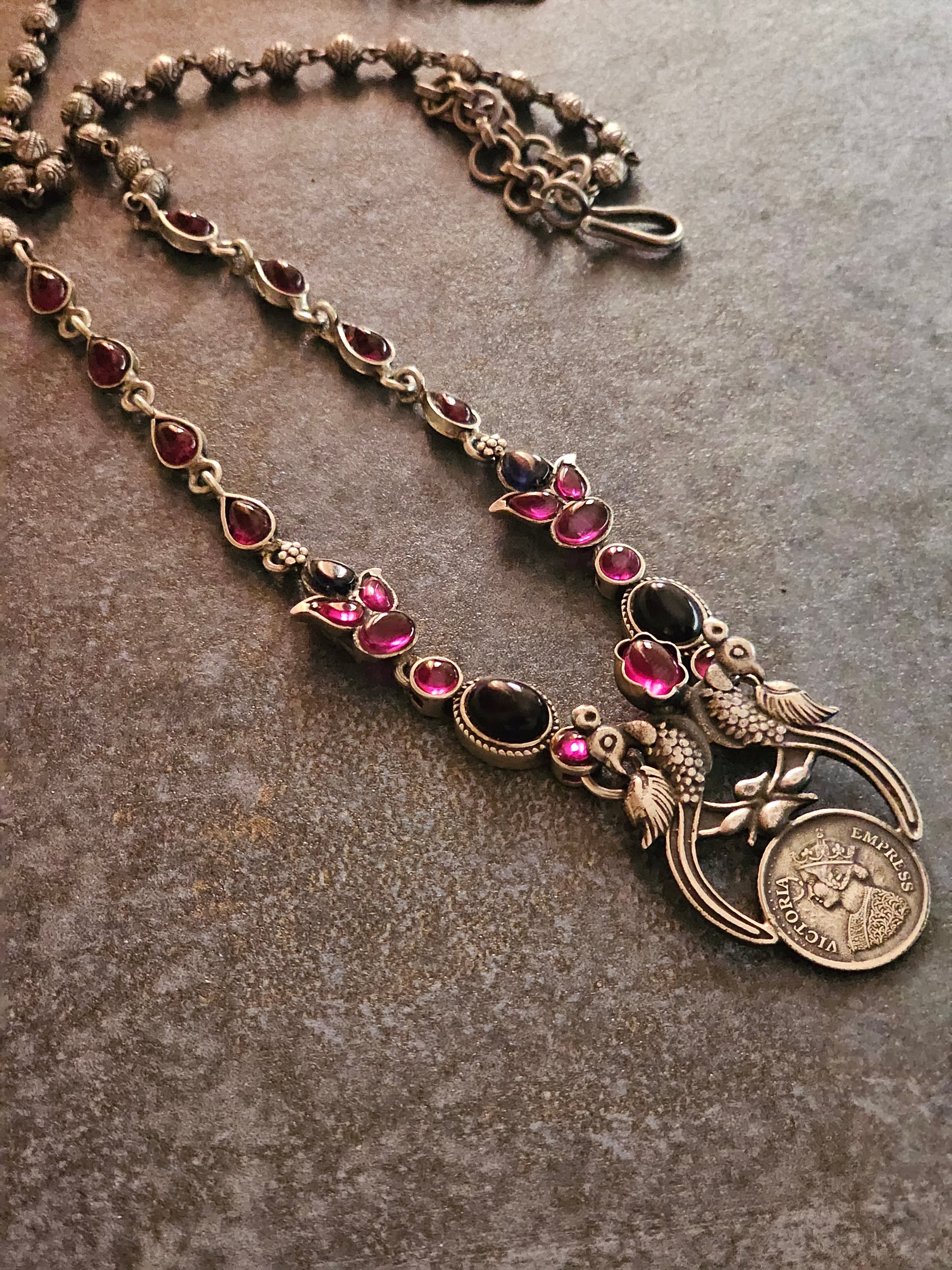 Elevate your traditional jewelry collection with our stunning Blue and Pink kempu silver 92.5 necklace. Featuring Victorian coin and peacock accents, this fusion piece is set on high-quality 92.5 silver. The simple Mohan mala back chain adds a touch of elegance to the 26" length necklace. Limited stock, don't miss out on this unique piece.
