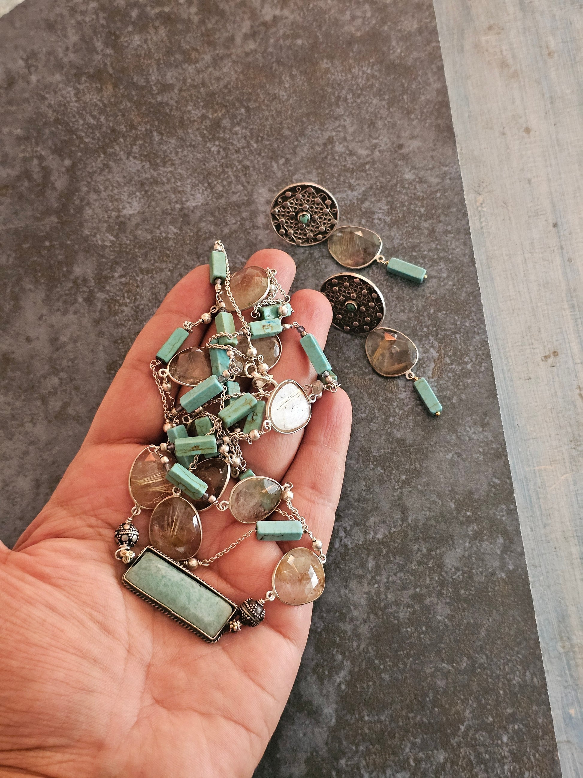 Add a touch of bohemian luxury to your wardrobe with our Golden Rutailed quartz and turquoise layered necklace. Crafted with a fusion of silver and genuine turquoise, this 28 inch chain features a unique bar pendant for a one-of-a-kind look. Elevate your style with this exclusive, must-have piece.