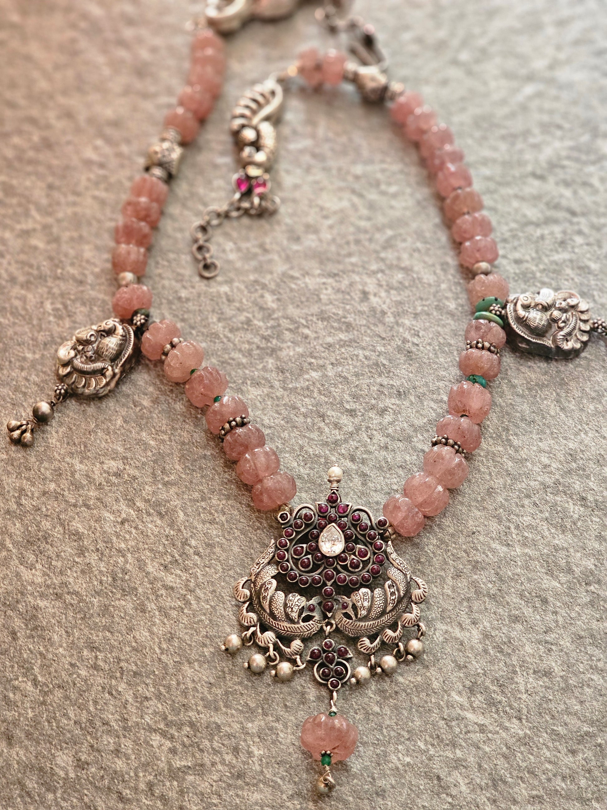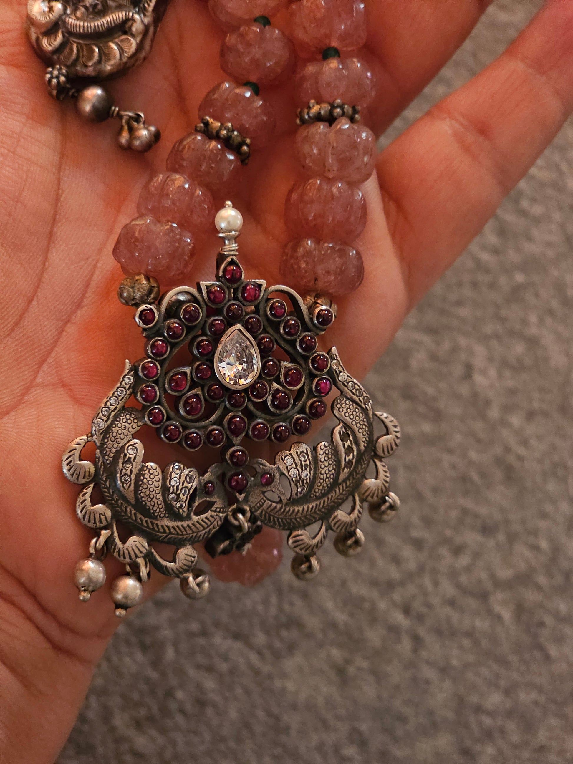 Kempu nakash-style peacock pendant with pink jade strawberry gemstones