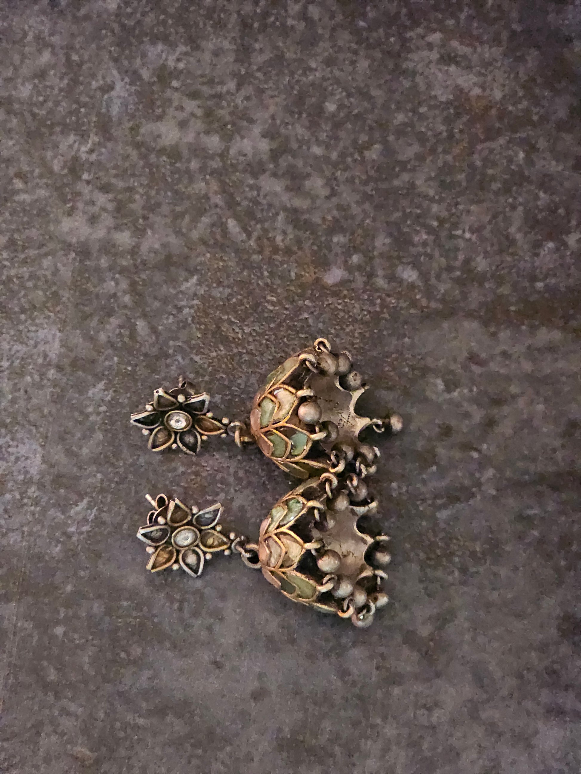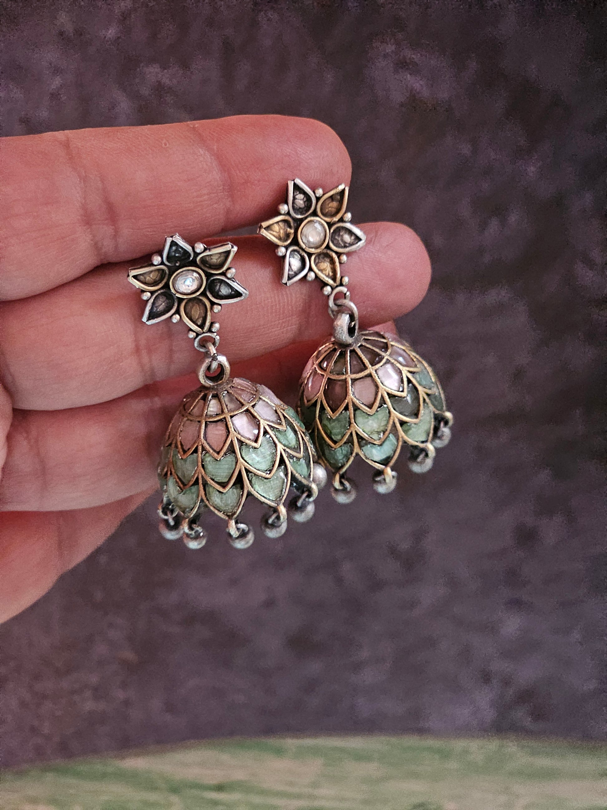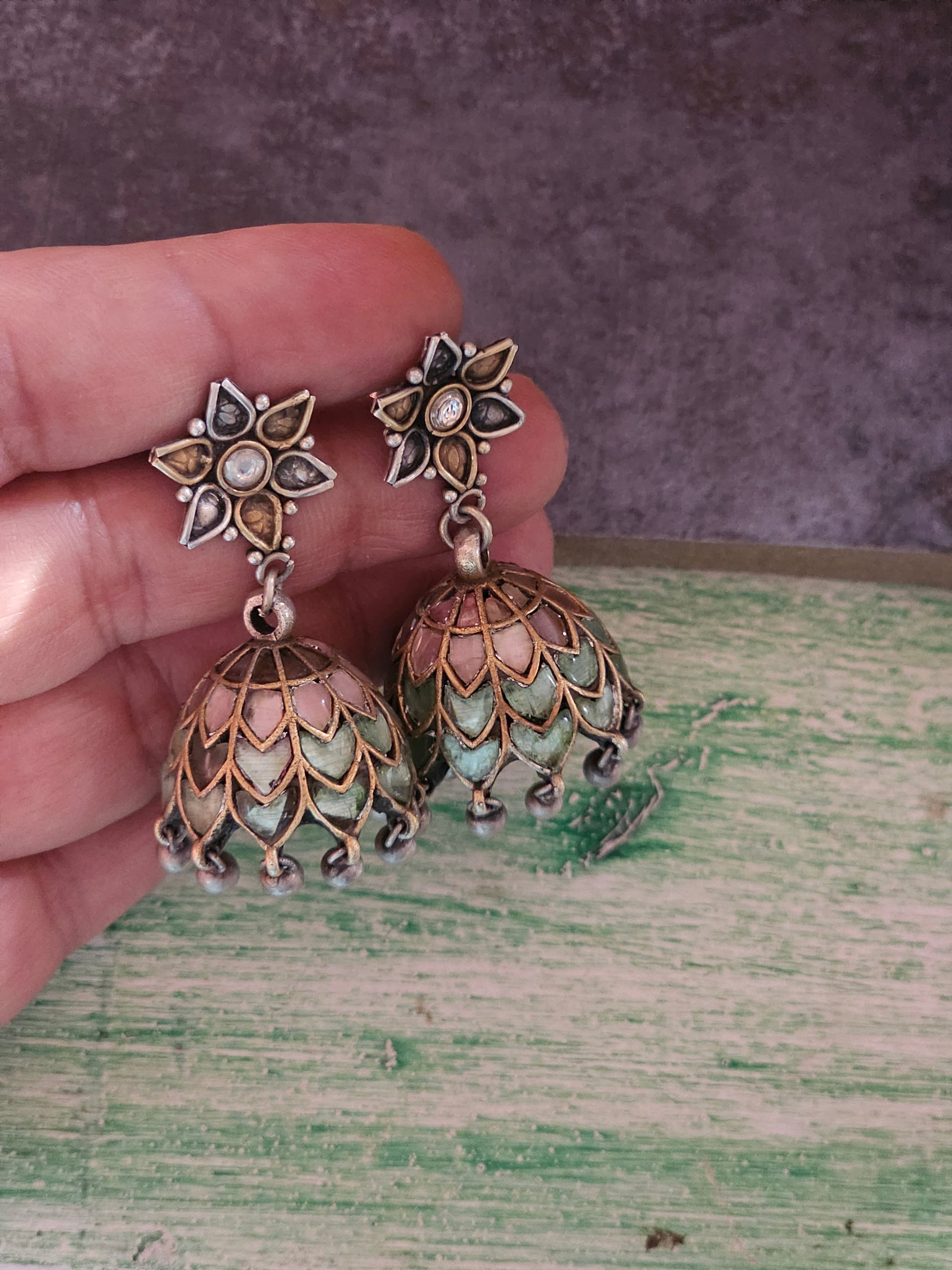 Pink and teal enamel jhumkis