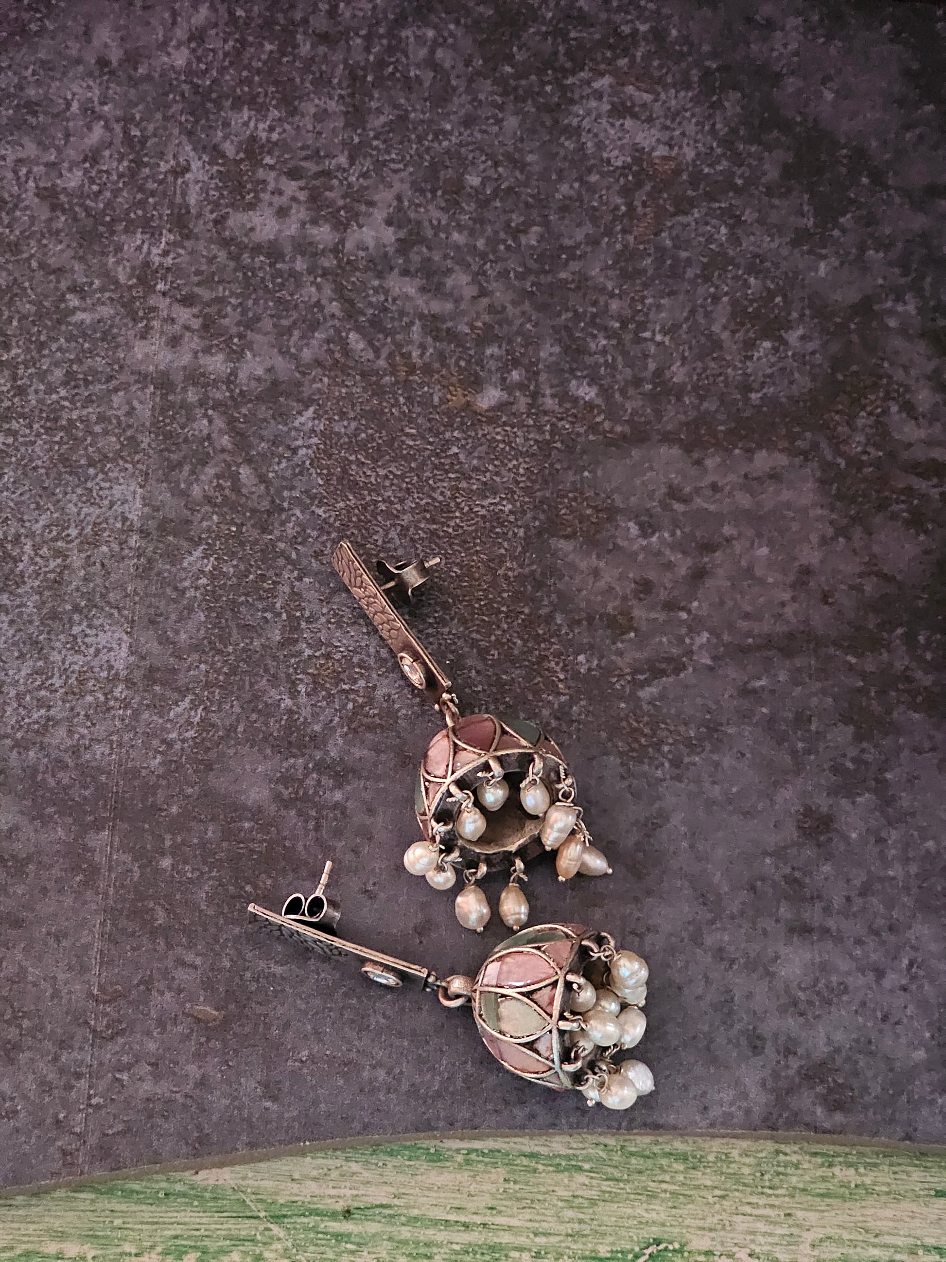 Pink and Turquoise enamel jhumkis