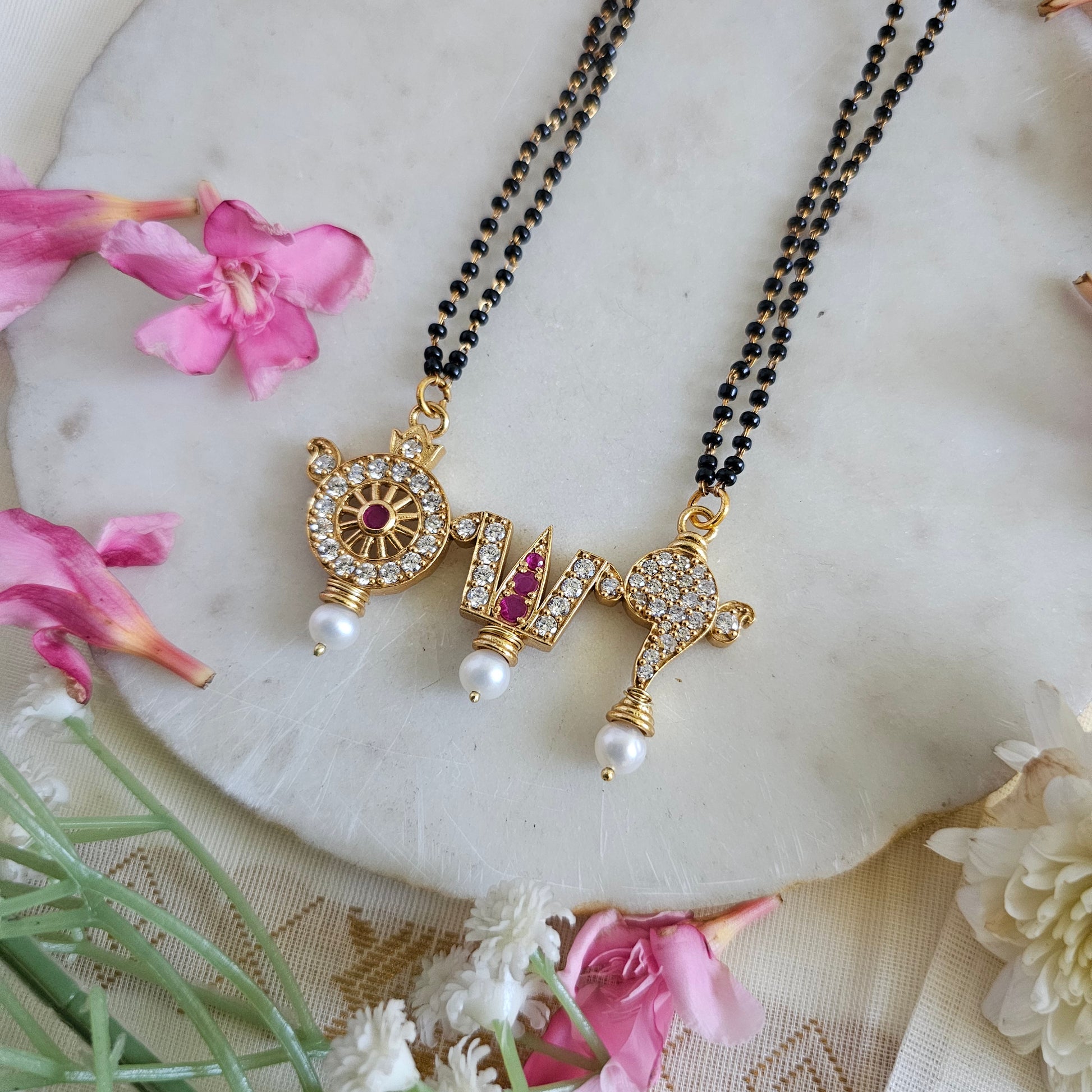 Silver handcrafted Mangalsutra in gold polish with Kemp shankh and Chakra pendant motif.