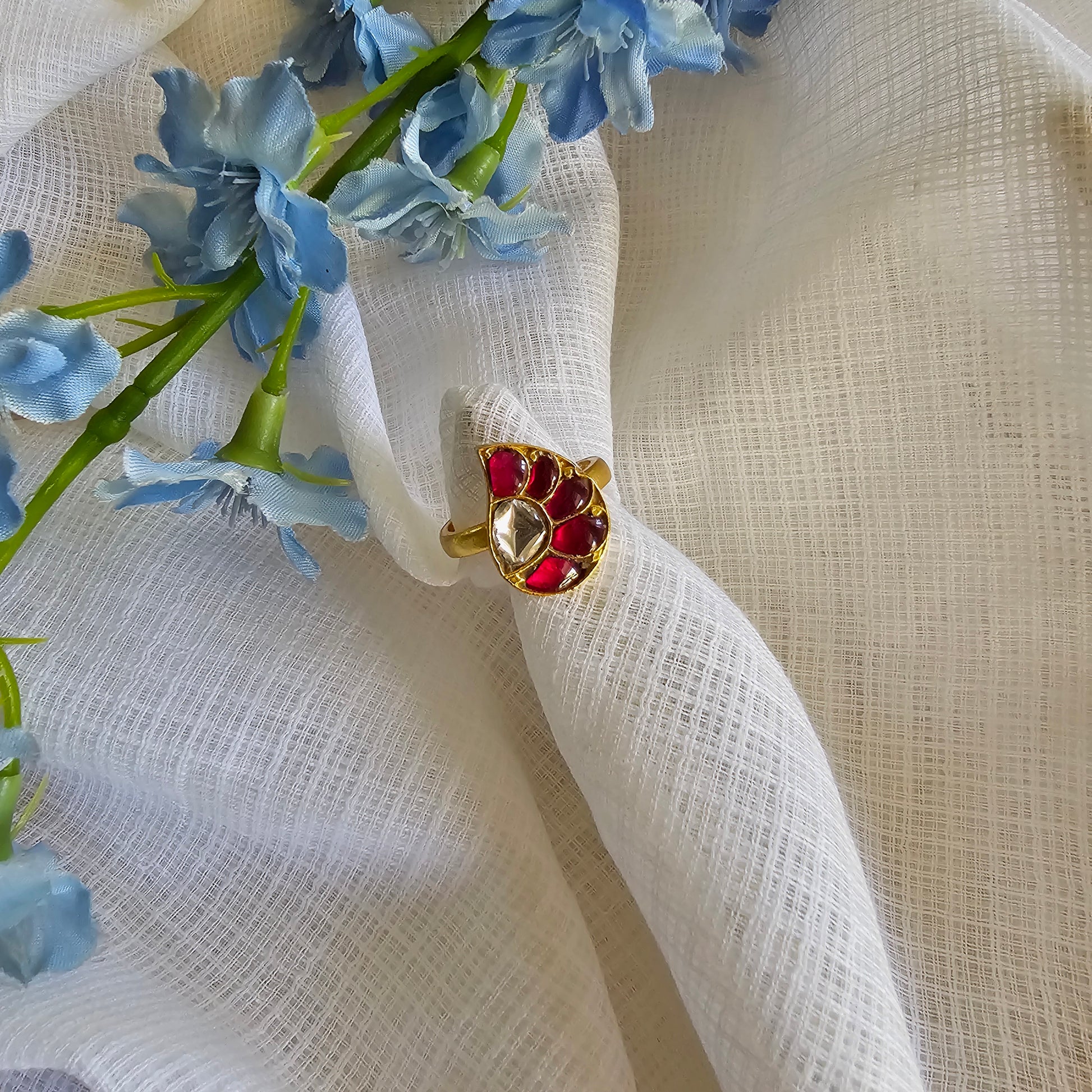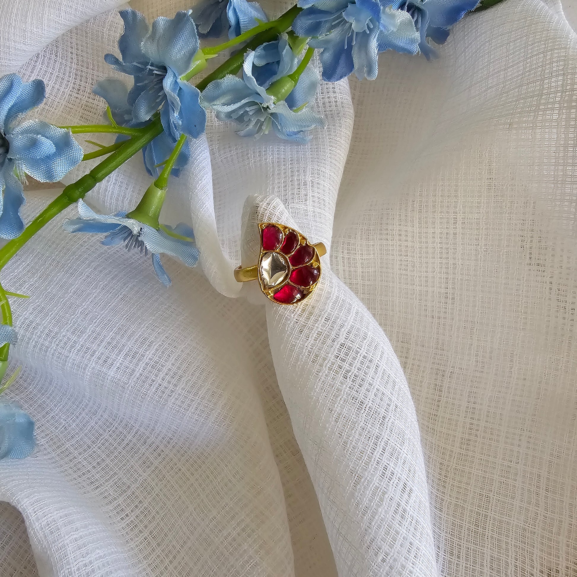 Silver 92.5 gold polish pink kundan and moissanite ring