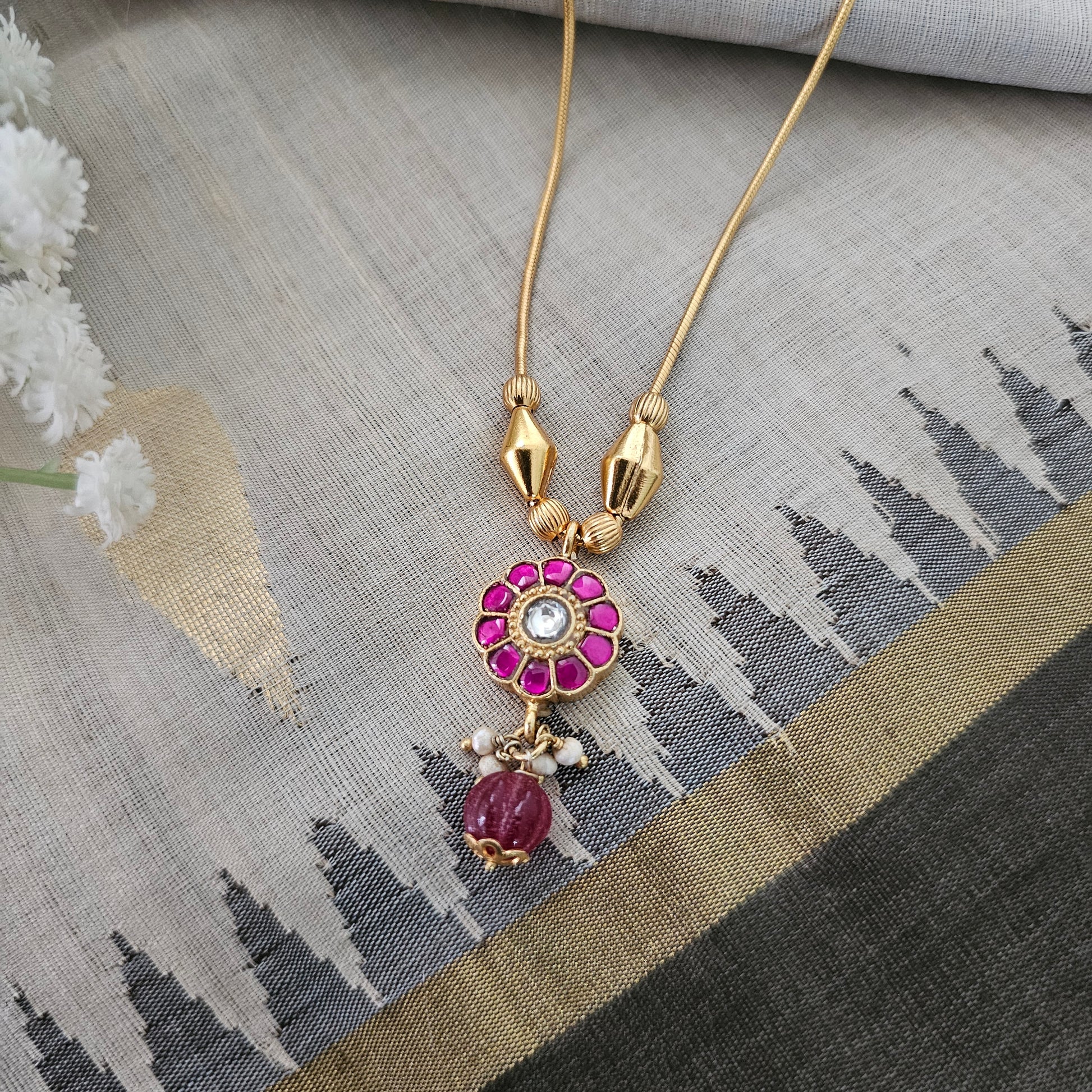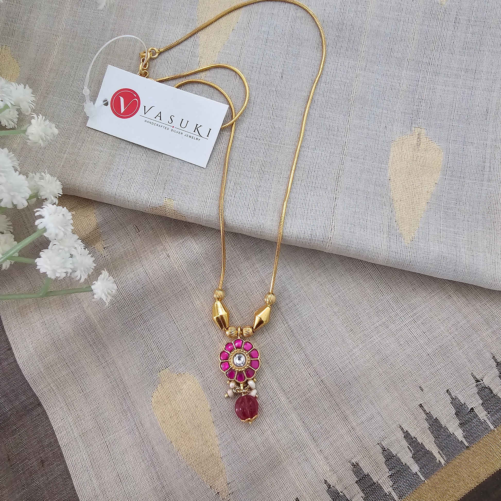 Silver 92.5 kundan gold finish chain with kundan rakodi motif and pearl detailing on the chain.