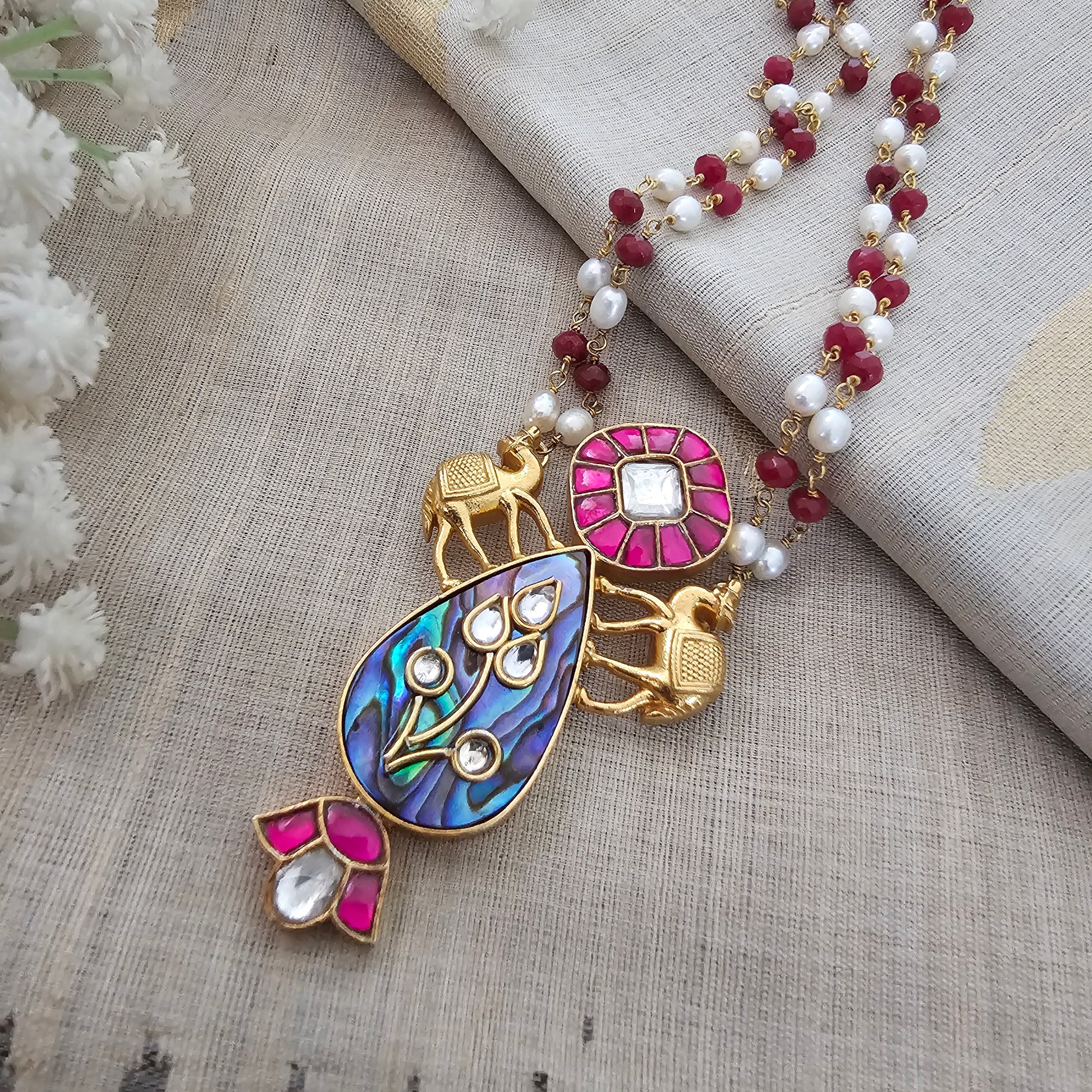 Silver 92.5 kundan gold finish chain with kundan inlay work motif and pearl and Ruby detailing on the chain.