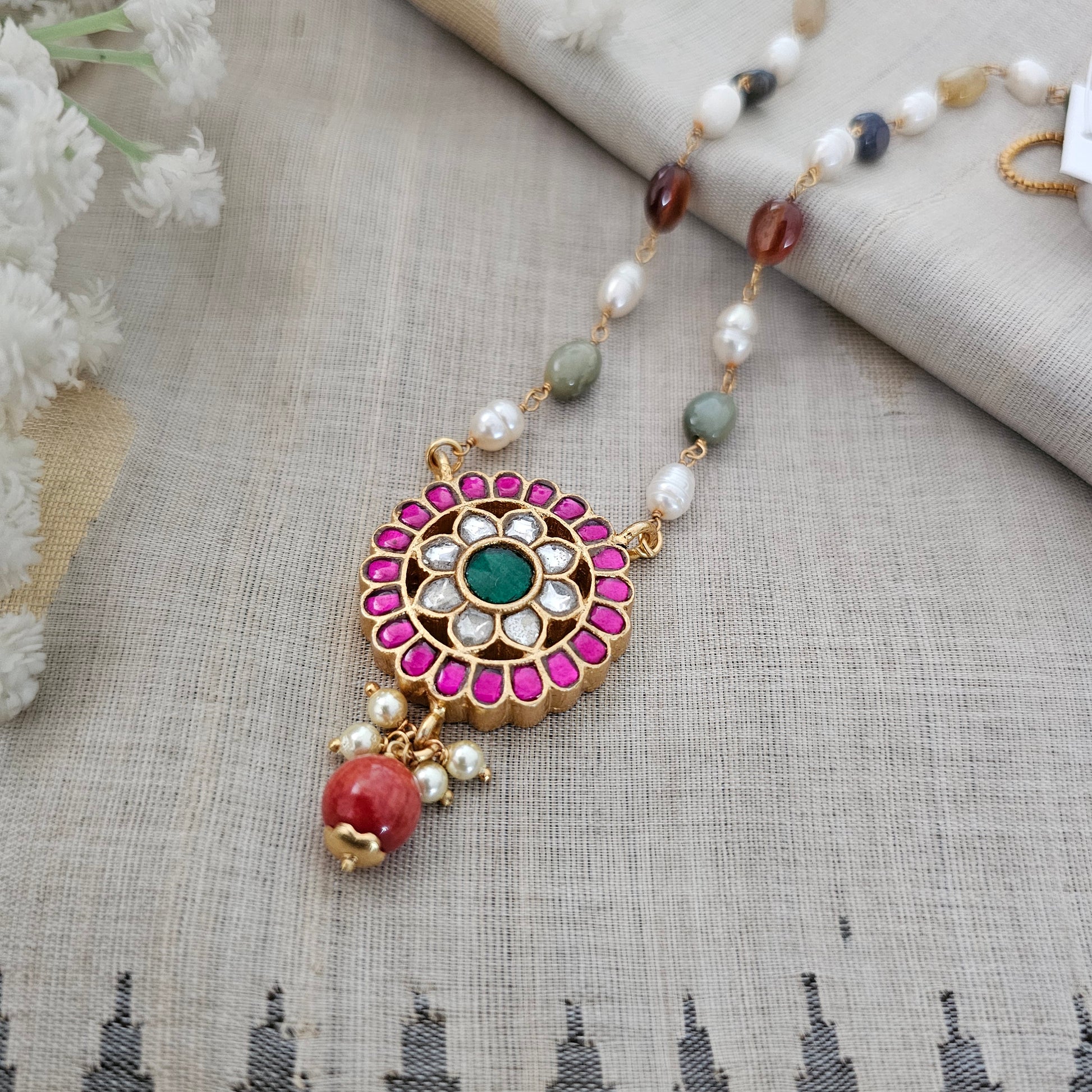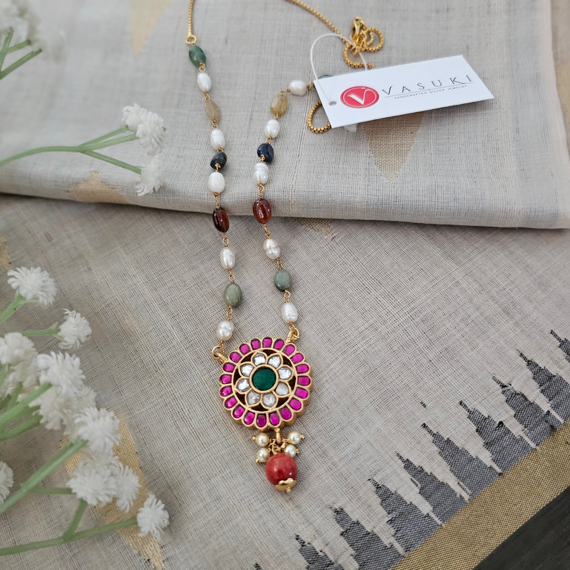 Silver 92.5 kundan gold finish chain with kundan lotus motif and pearl detailing on the chain.