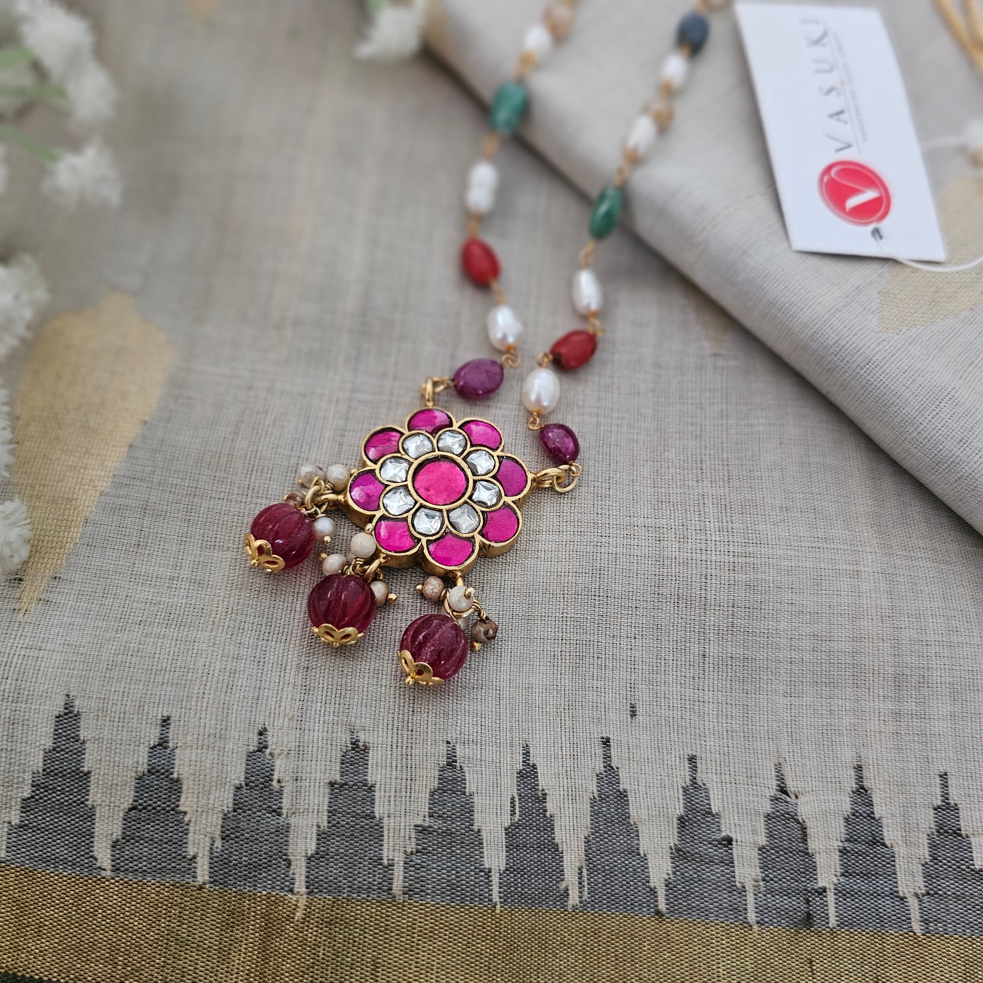 Silver 92.5 kundan gold finish chain with kundan rakodi motif and pearl detailing on the chain.