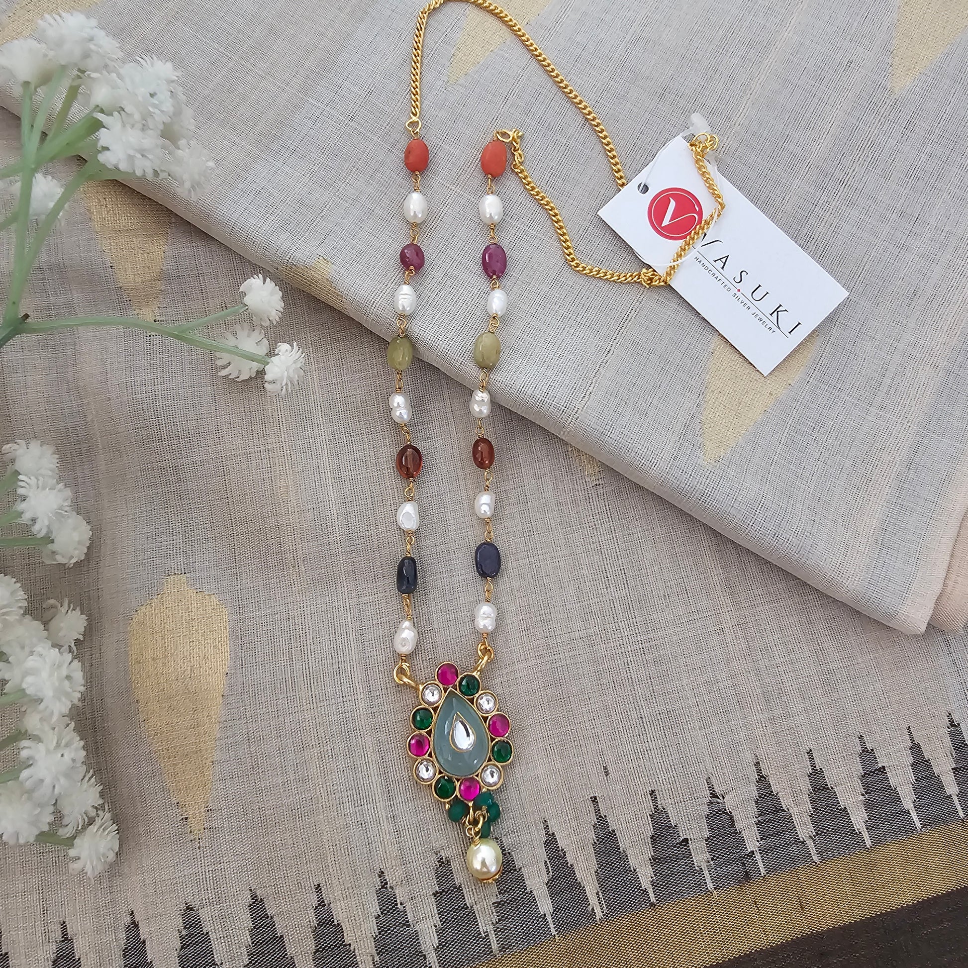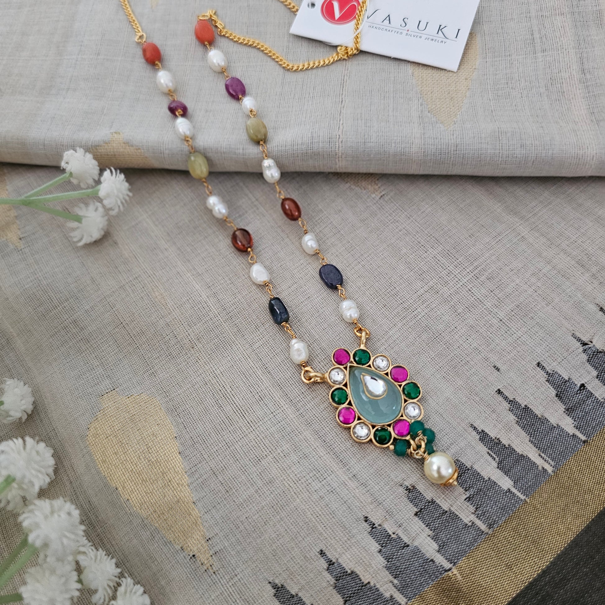 Silver 92.5 kundan gold finish chain with kundan lotus motif and pearl detailing on the chain.