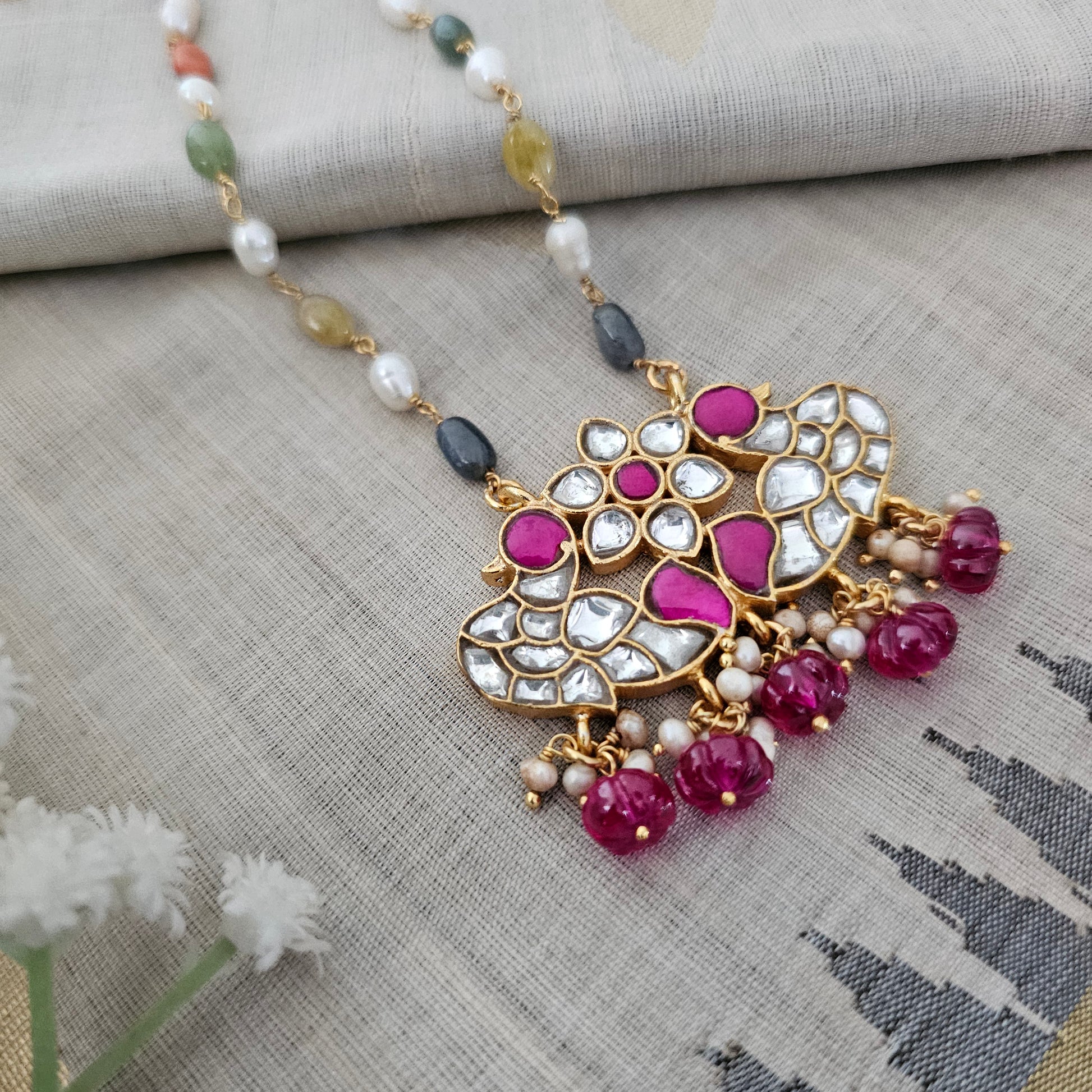 Silver 92.5 kundan gold finish chain with kundan swan motif and pearl detailing on the chain.