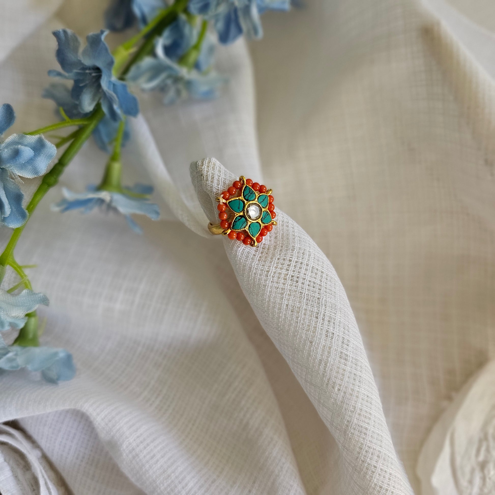 Silver 92.5 kundan gold polish turquoise with coral ring
