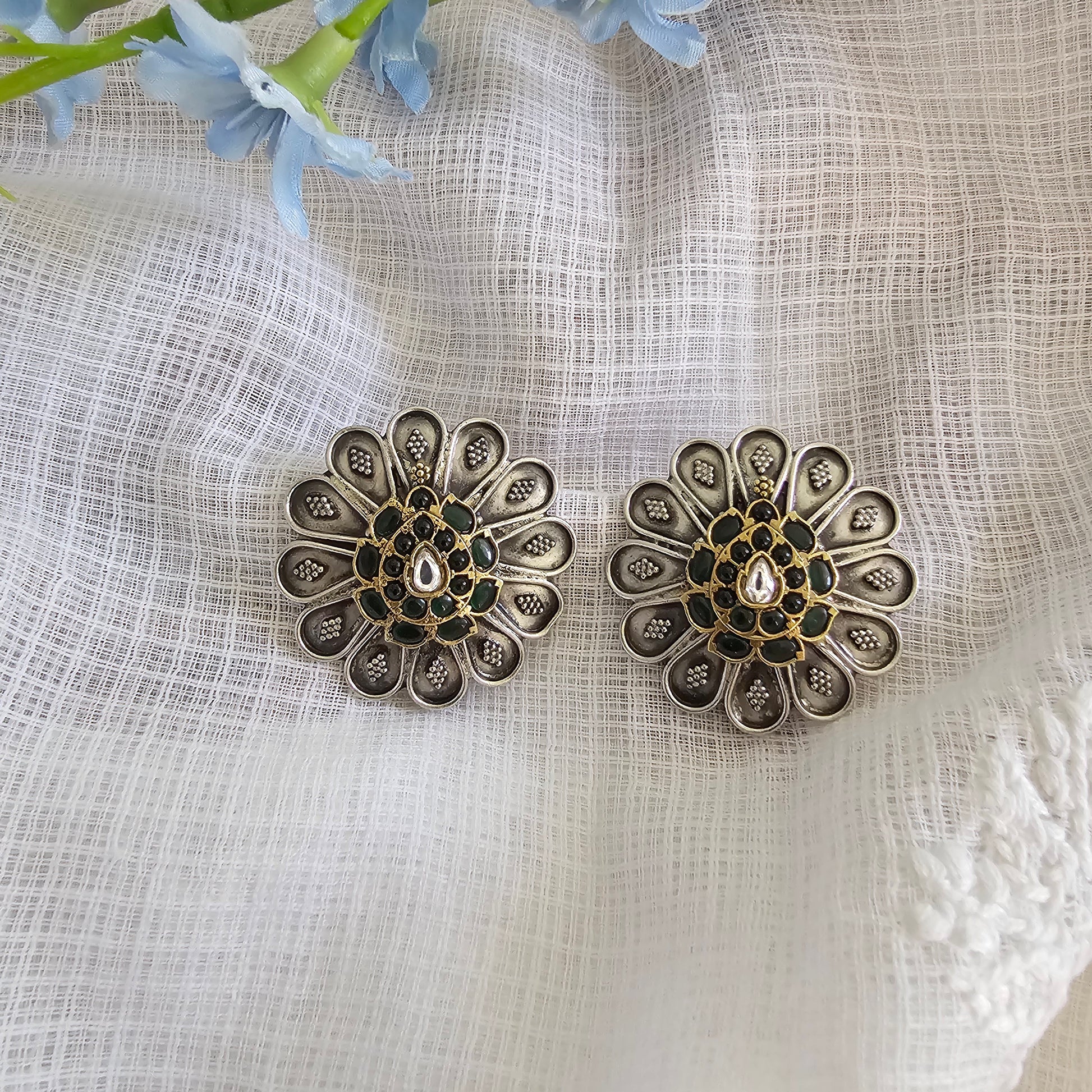 Silver 92.5 kundan two tone green statement studs.
