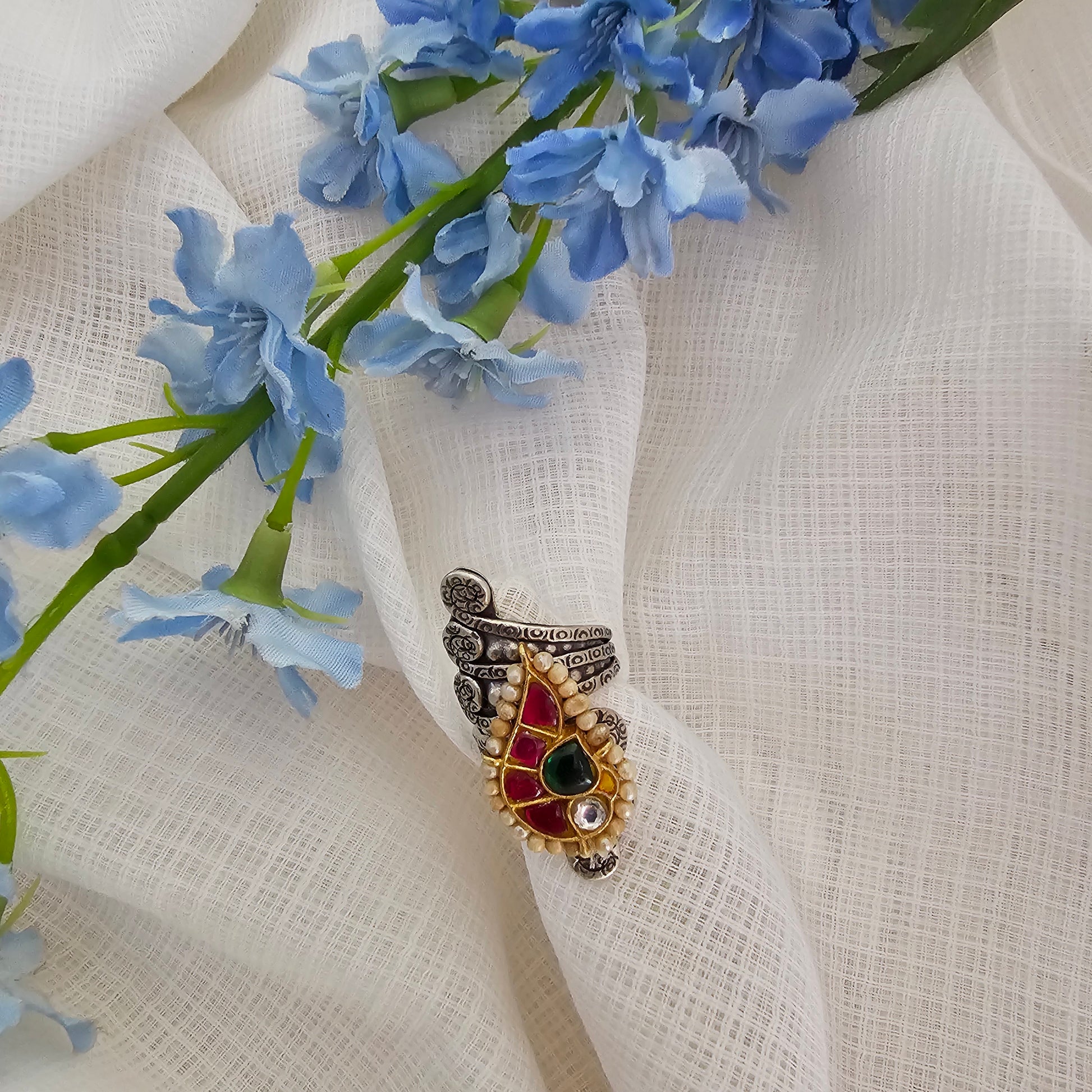 Silver 92.5 two tone finish with kundan and hand stamped ring