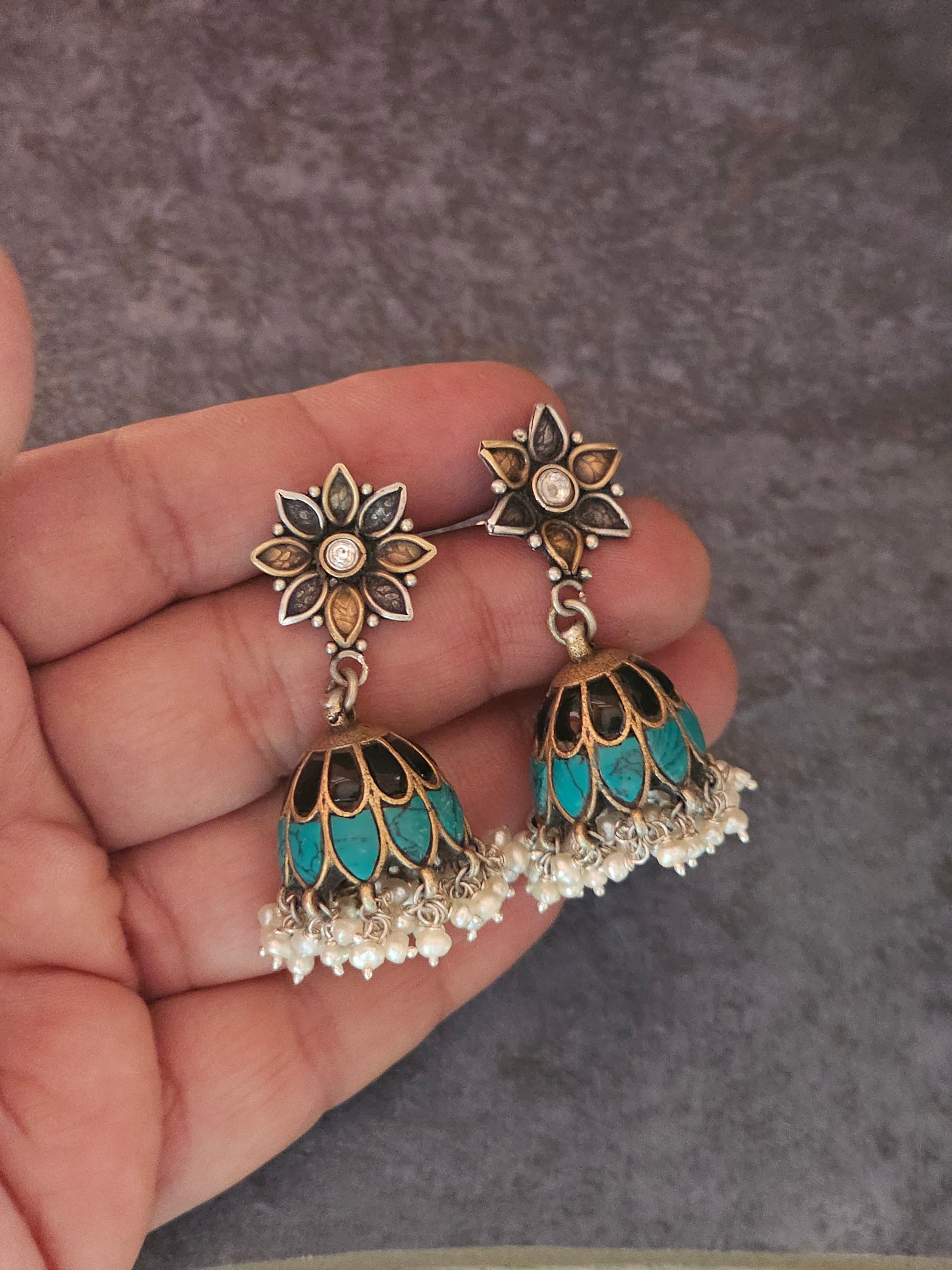 The Turquoise and Lapis Lazuli Fusion Silver Jhumkas feature a Kundan setting, combining the rich hues of lapis lazuli and turquoise. Weighing 30 grams and measuring 2 inches in length, their vintage design provides elegance while ensuring comfort. Ideal for enhancing traditional attire, these jhumkas are a seasonal essential.