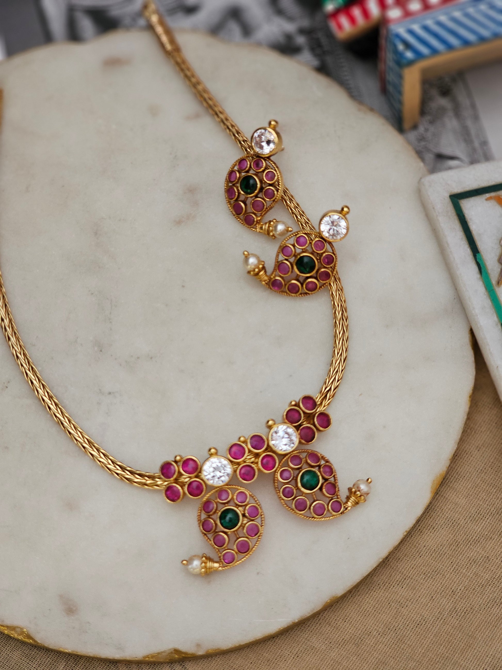 A revival of timeless charm — the Manga Malai is a handcrafted 92.5 silver Adigai necklace set finished in antique gold polish. Inspired by the yesteryear Adigai styles, this short chain features beautifully detailed mango (paisley) pendants strung on a flat Adigai link, blending heritage artistry with modern elegance. Measuring 18 inches with an adjustable tassel for comfort, it sits gracefully on the collarbone — perfect for festive sarees or contemporary silhouettes.