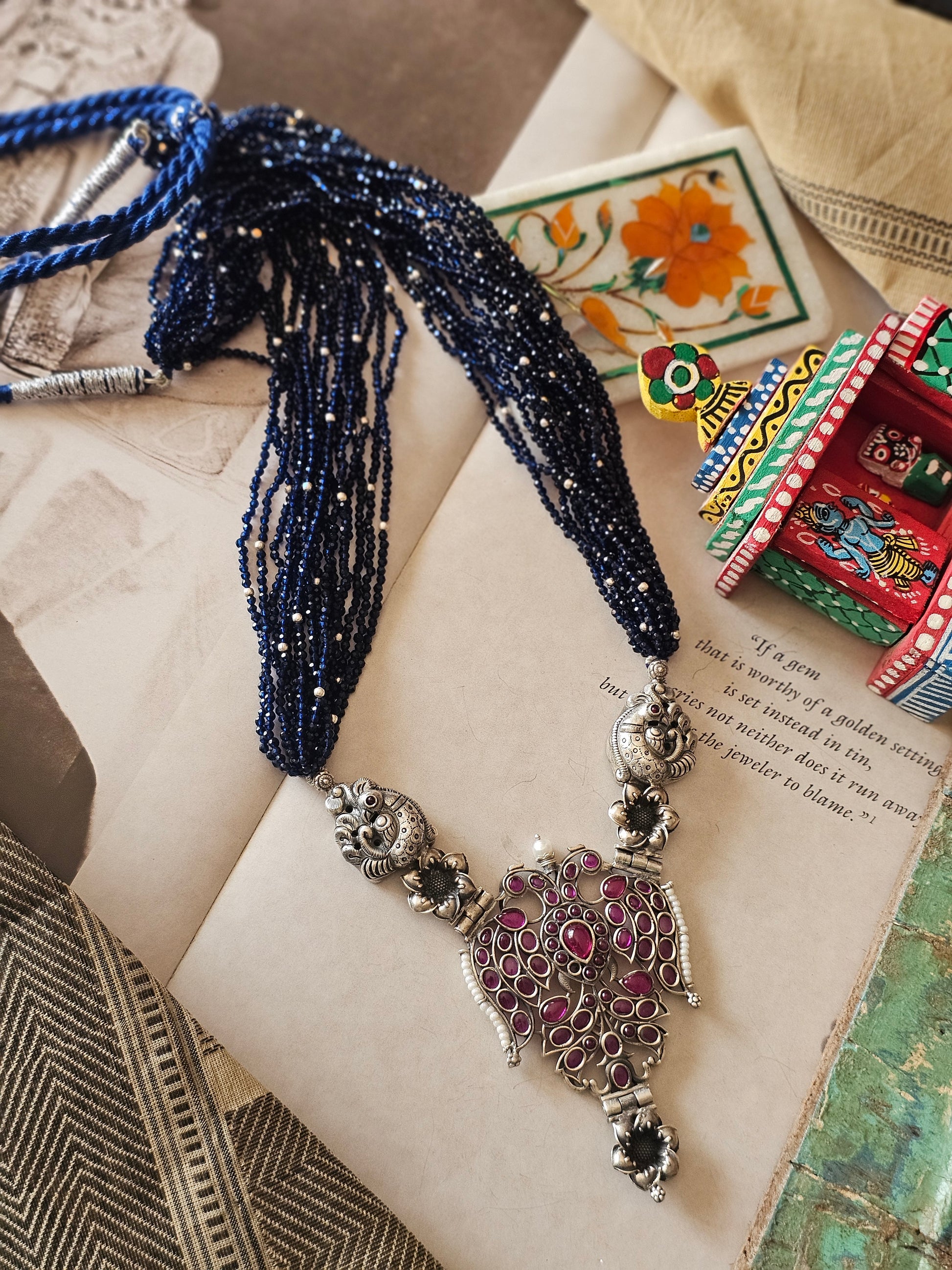 A symbol of power and protection, this handcrafted Gandaberunda necklace is a striking fusion of heritage and modern design. Made in 92.5 silver, the pendant is set with radiant Kempu stones and strung with deep blue iolite beads, interspersed with tiny silver accents. The adjustable ink-blue tassel adds both comfort and elegance, making it versatile for festive wear and statement styling.